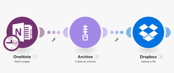 In this case, you can easily archive the pages you want to send with the help of Make. Simply choose where to start grabbing the pages from, then connect OneNote to the Archive aggregator to archive them into a zip file, and then upload it to Dropbox.