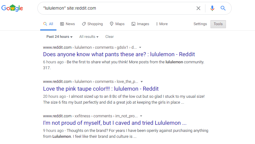 For example, let’s imagine that I work for the athleisure brand Lululemon, and that I wish to see what the brand mentions were like in the past 24 hours. This is what my refined search will look like: