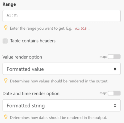 Additionally, like the Get Range Values module, the Search Rows module also allows you to specify how you would like to render the values and the dates. You can learn more about this module here.