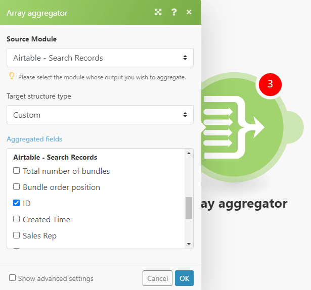 Since you want to aggregate the Airtable records, select this as the Source. The “Target structure type” is automatically selected for you, so all you need to do is tick ID under Airtable > Search records in the “Aggregated fields” box.