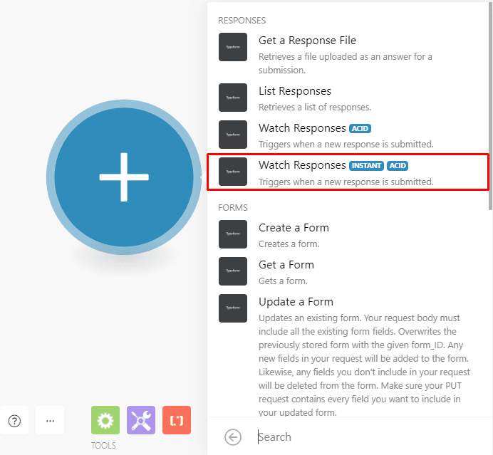 Typeform has an instant module that uses a webhook to instantly receive the form’s responses. Let’s use this module which is called “Watch responses”.