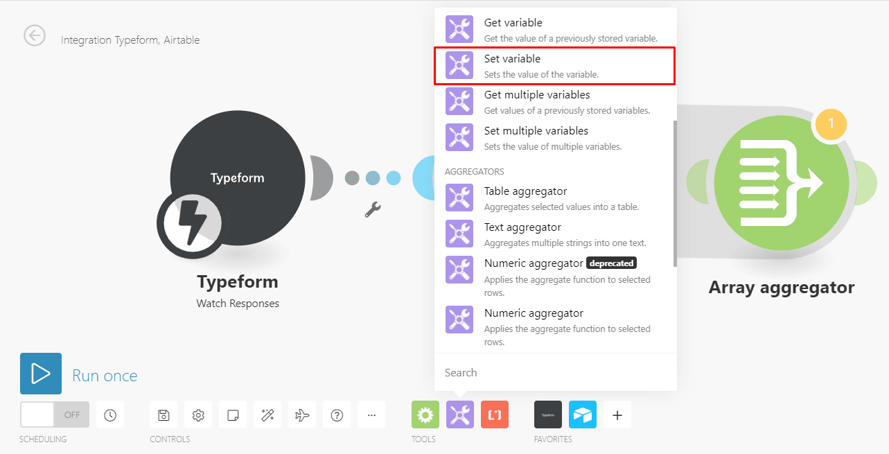 Down in the Tools menu, select the “Set variable” module and attach it to the array aggregator.