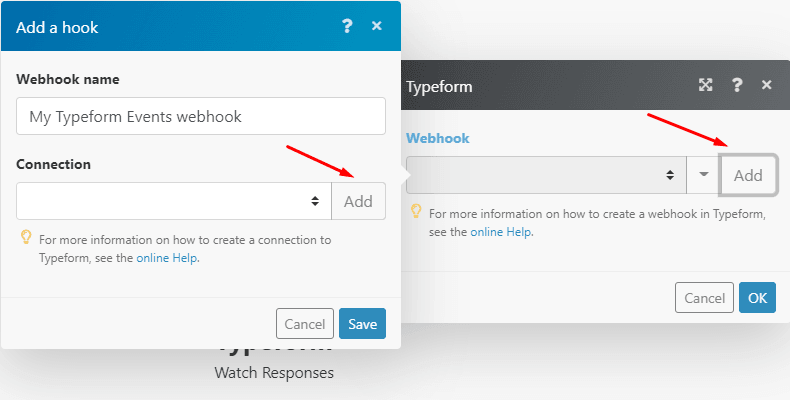 Next, click the “Add” button in the webhook configuration box (the one you’re on) to connect your Typeform account to Make.