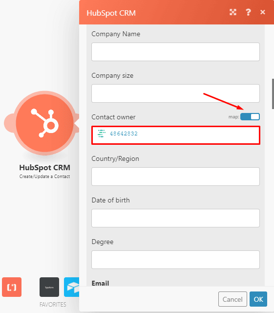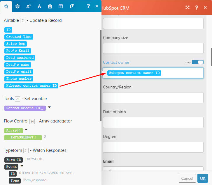 Once all the reps have their contact owner IDs in Airtable, map the “HubSpot contact owner ID” element from the “Airtable > Update a record” module to the “Contact owner” field to make it dynamic.