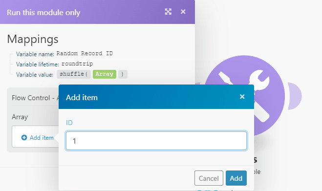 In the “Record ID” field, map the ID element outputted by the “Set variable” module.