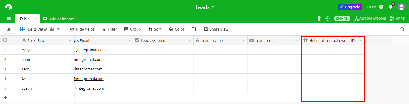 In the second step of this tutorial we mentioned that the Airtable base has a field for the sales rep’s HubSpot contact owner ID that you should add manually.