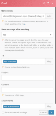 The image to the left is the Settings panel in the Send an email module. Here, you can customize the Subject and the Content that would be sent to you.