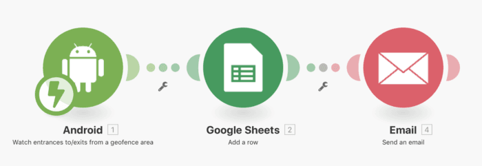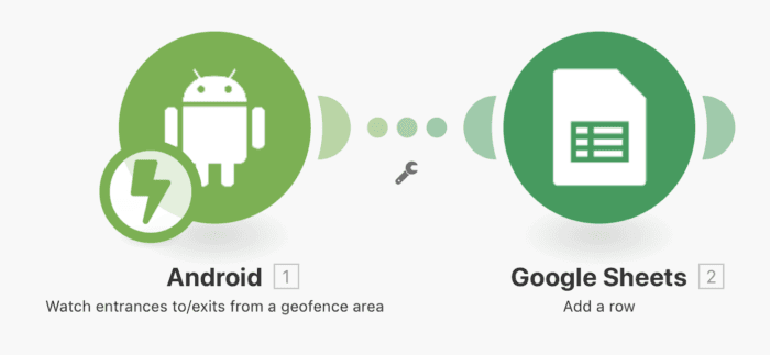 To set this into action you will need to create a scenario, as seen below. The scenario will begin with the Android app, and the Watch entrances to/exits from a geofence area and then you will want to connect it to your spreadsheet by using the Google Sheets, Add a row module.
