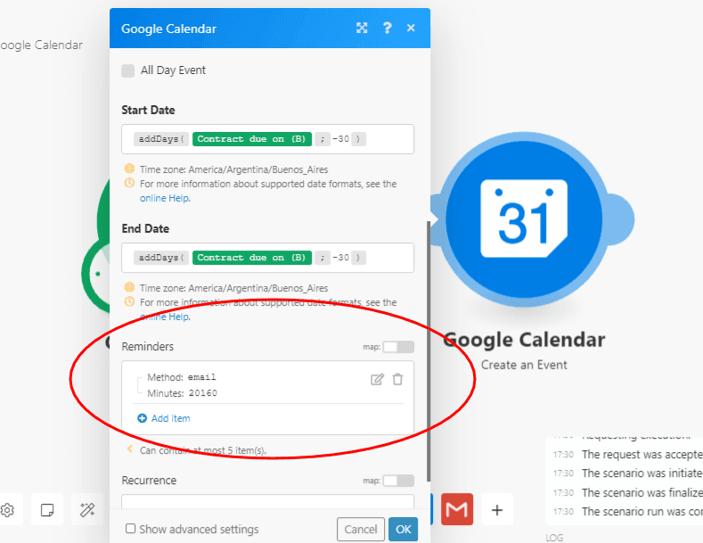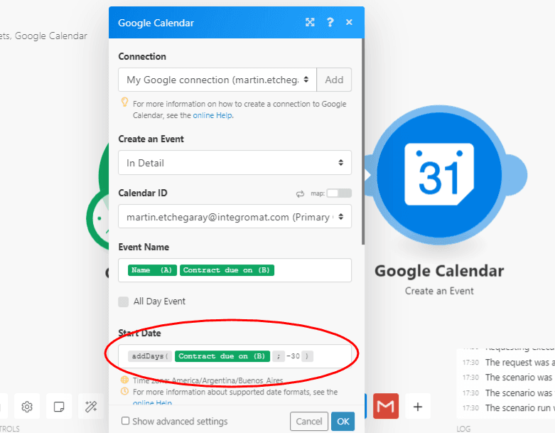3. Whenever it detects a new record on the spreadsheet, Make creates a Google Calendar event and schedules these for 30 days before contracts expire. The key is in a little formula you can see below: