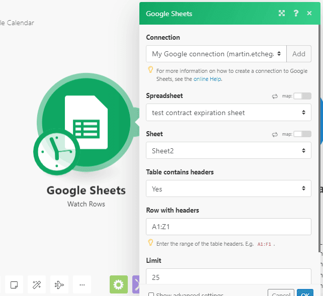 2. Using the “Watch Rows” Google Sheets module, Make automatically watches the spreadsheet on a regular basis (I set it up to twice a day, but you can change to suit your needs)
