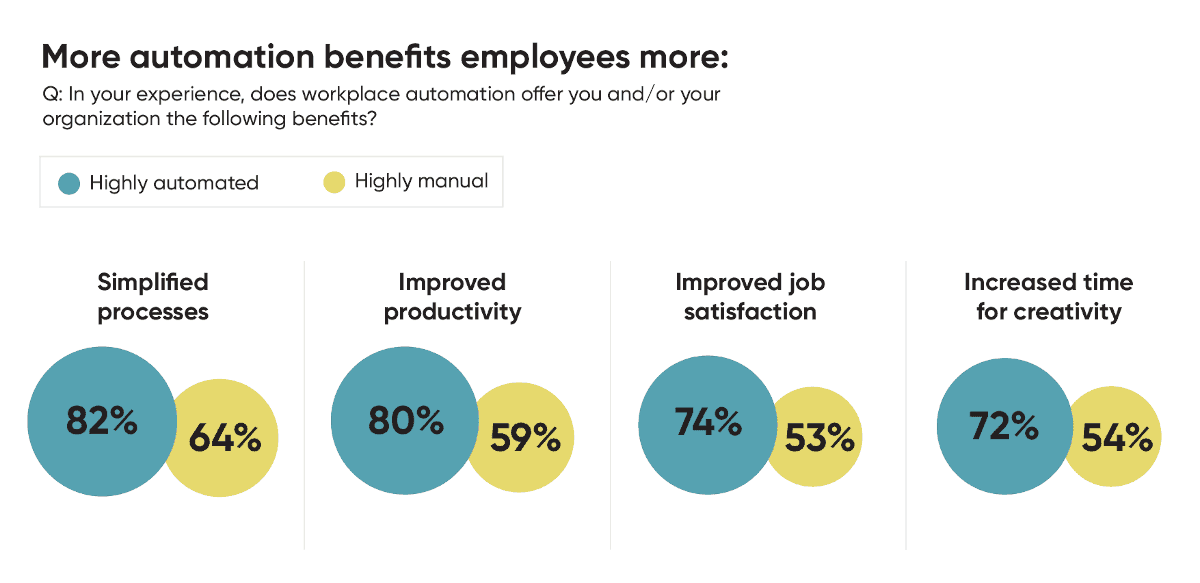 Studies show that 74% of employees in the most automated companies say automation improves job satisfaction, compared to 53% in highly manual companies.