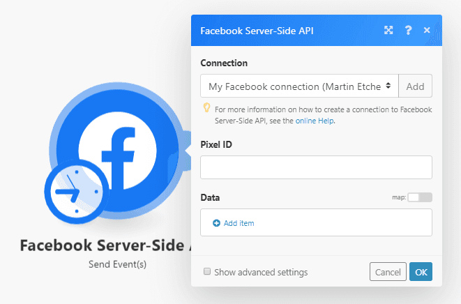 Once you have these, you will have to connect your Facebook account to Make. It only takes a couple of clicks using Make’s Facebook Conversions module.