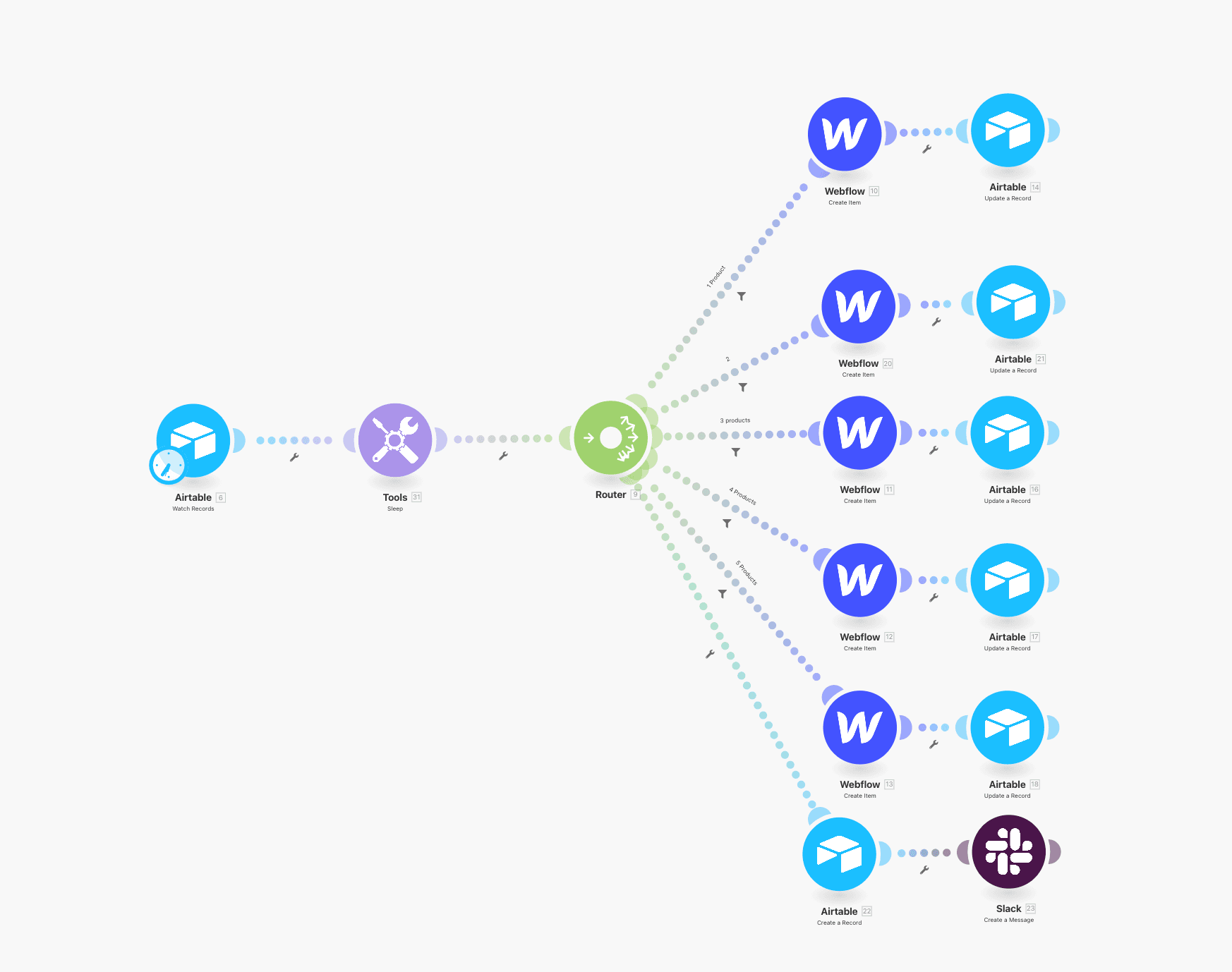 Once a new entry pops up in the database, the Make scenario automatically generates Stripe products and a Webflow page complete with testimonials, tags, and more.