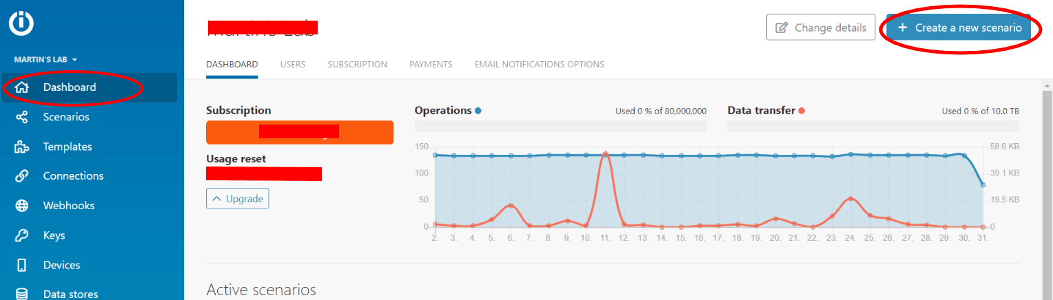 In order to get access to the Facebook Pages API, go to your Make dashboard, and hit the “Create a new scenario” button on the top right of your screen.