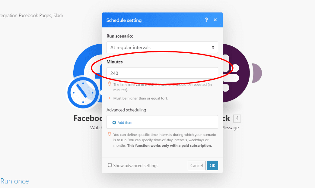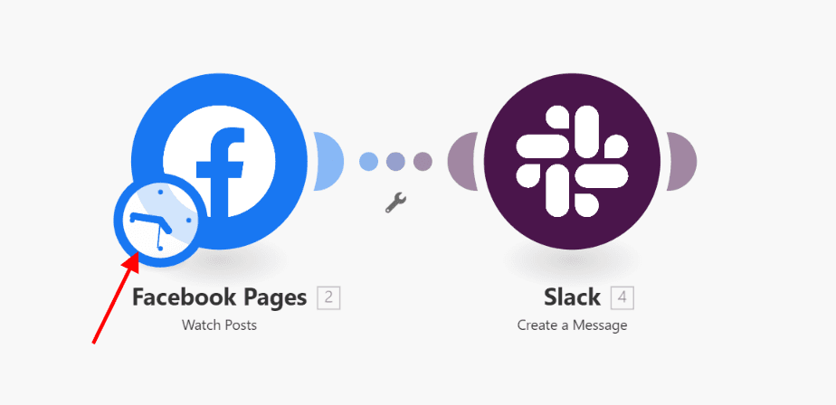 This means that we have to define how often Make will check for new posts on your Facebook Page. To do this, click on the little “clock” symbol next to the Facebook Pages module.