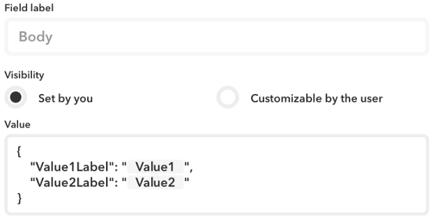 The JSON can contain an arbitrary amount of values. Value1Label is a label of how the value will be presented in Make. {{Value1}} is an ingredient from the IFTTT trigger.