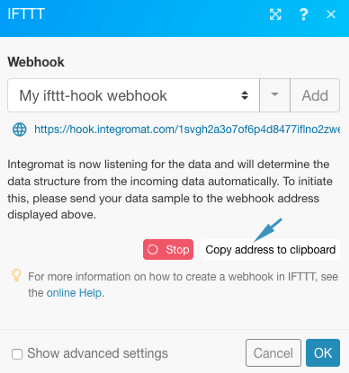 Once the webhook receives the sample data, click ‘OK’ to continue and use the data received from IFTTT in subsequent modules of your Make scenario.