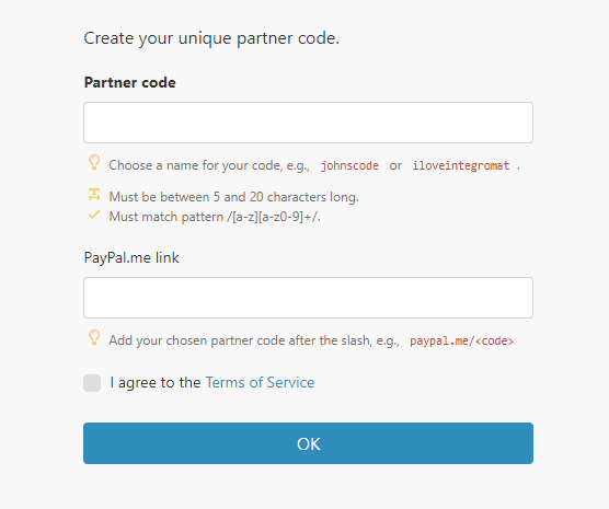 You will land on the affiliate program page. Here, you have to choose a name for your code, add your PayPal.me link, agree to the terms of service, and click “OK”.