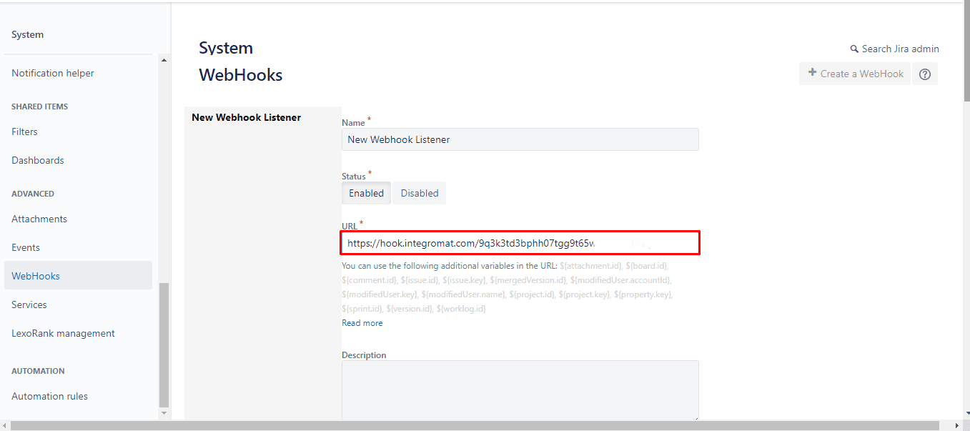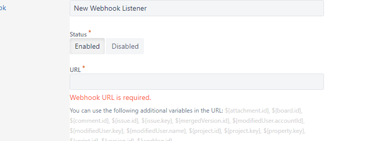 Next, you will have to name your webhook, determine the URL (following Jira’s parameters for webhook URLs), place it in the corresponding field and set the webhook status to “Enabled”.