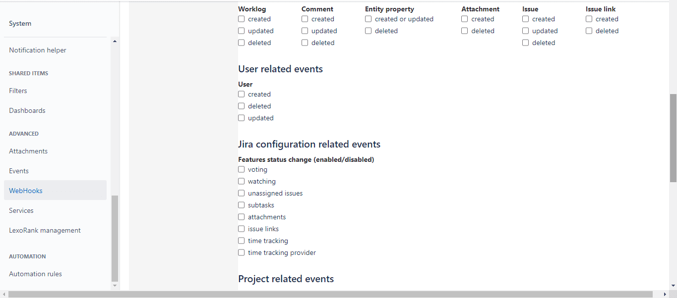 These represent different categories of data payloads that you can send to a Jira webhook. You can check the full list of events available for Jira webhooks in the corresponding Atlassian Developers page.