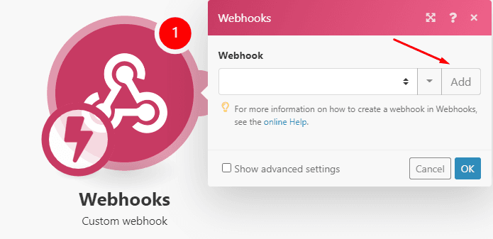 On the screen that follows, click on the circle at the center and look for the “Webhooks” app. Once you find it, click it and select the “Custom webhook” module.