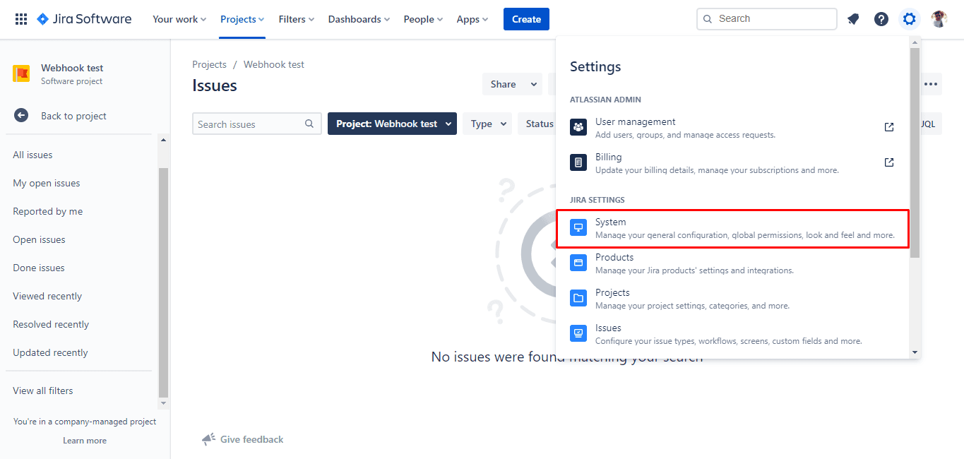 To create a webhook in Jira, click on the little settings icon at the top right of your screen, and then select the “System” option from the dropdown.