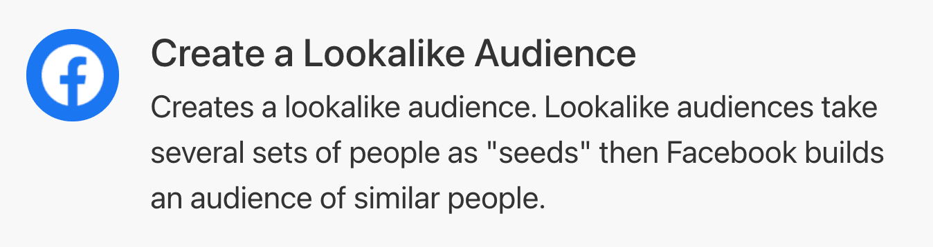 Using Make, you can leverage the “Create a Lookalike Audience” module for Facebook. This module will help you build audiences automatically from mailing lists or other campaigns such as Google Lead form ads.