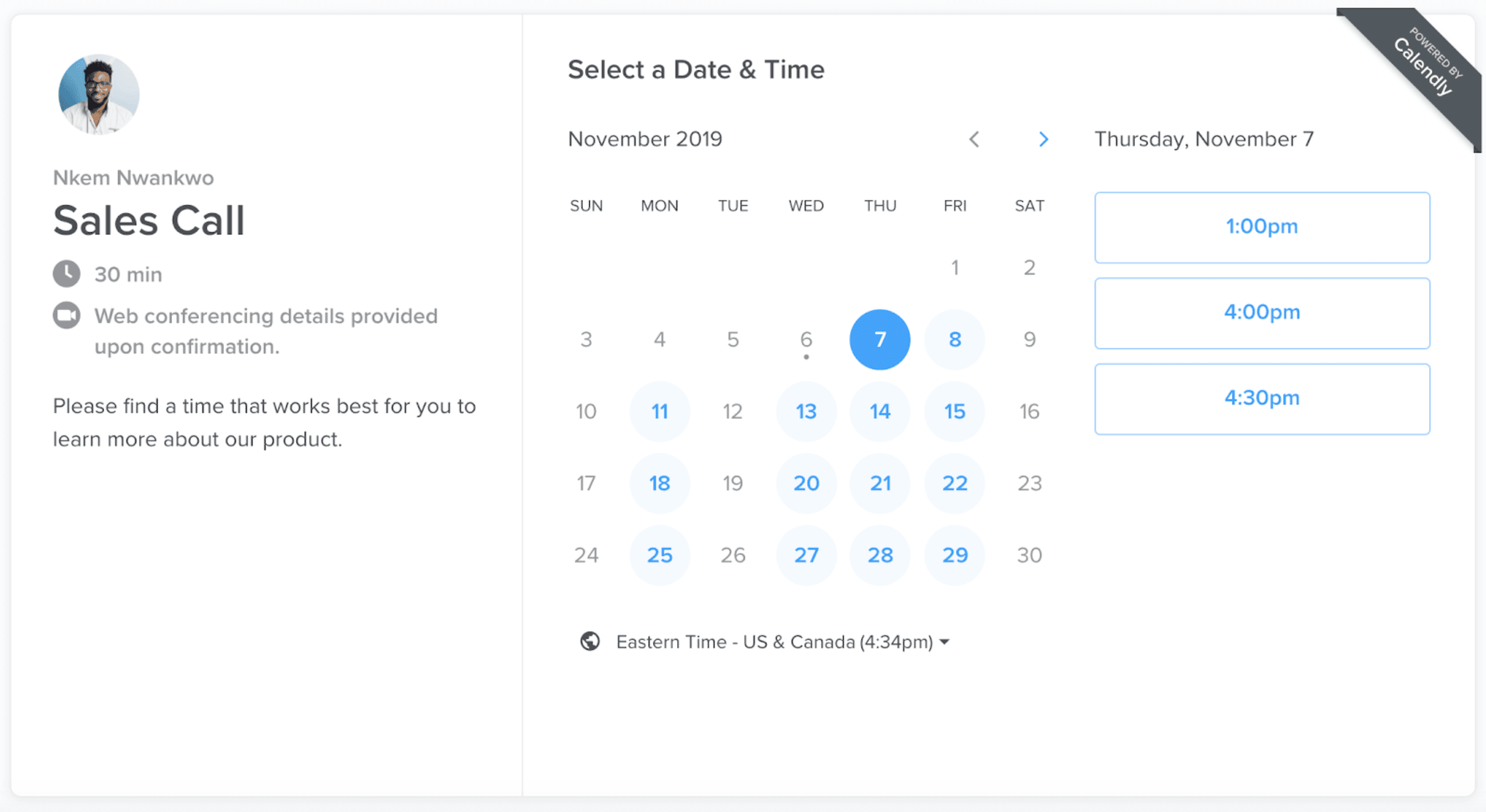 When it comes to client meetings, you might not be so keen as to share your full calendar. Tools like Calendly will allow you to share a public link for clients and external stakeholders showcasing your availability, and allowing them to book a time at their convenience.