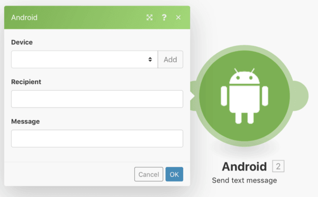 Once configured, you will add the next module. In this case, we will use the Android app and the Send text message module.
