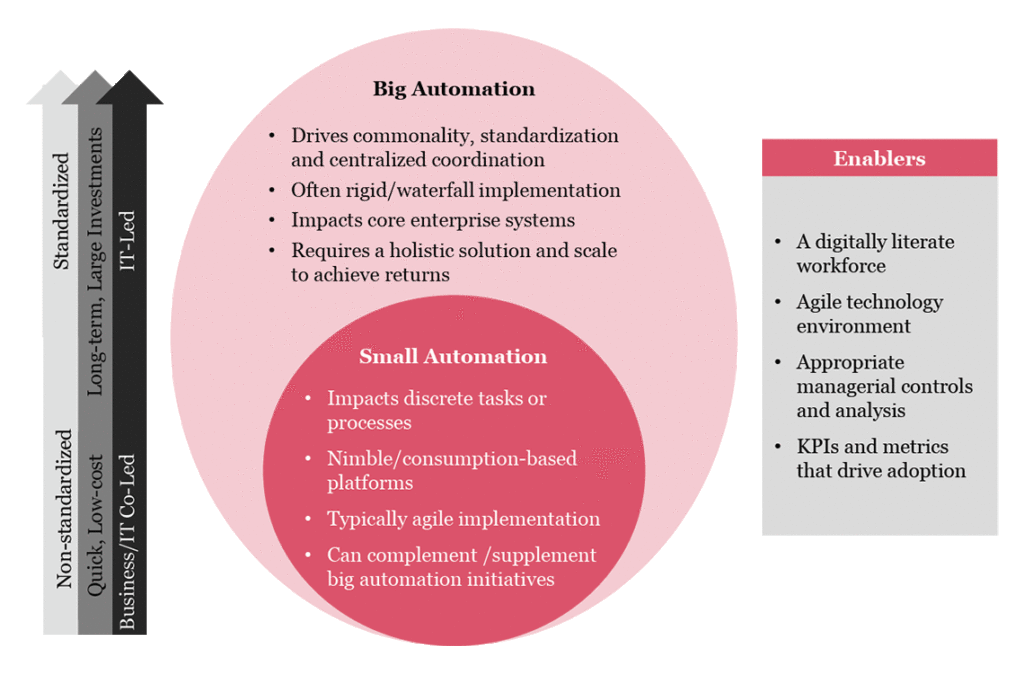 Small automation is used more often than big automation and usually aims at producing short-term productivity gains.