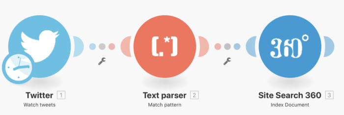 Every time a watched Twitter handle tweets a message with a link that you are watching for, Make will automatically send it to SS360 and add it to your index.