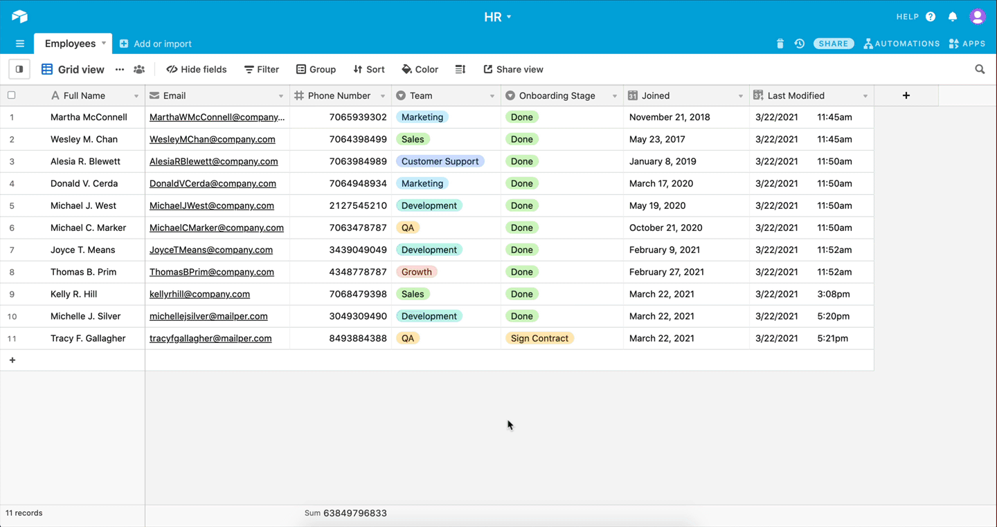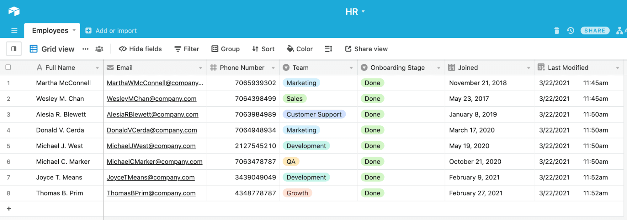 Before we automate, we will set up an HR database in Airtable. The database will contain records for all our employees.
