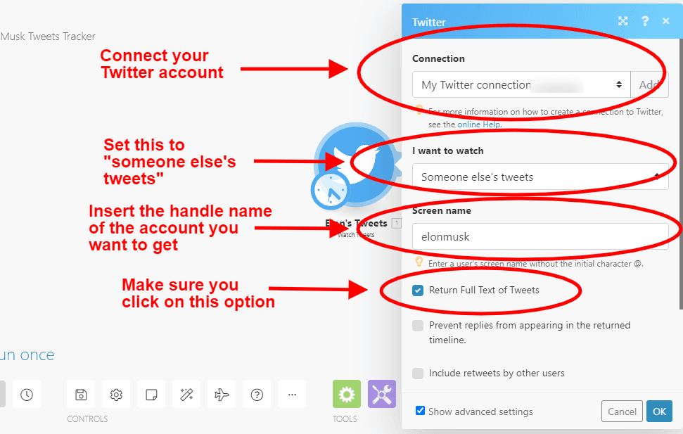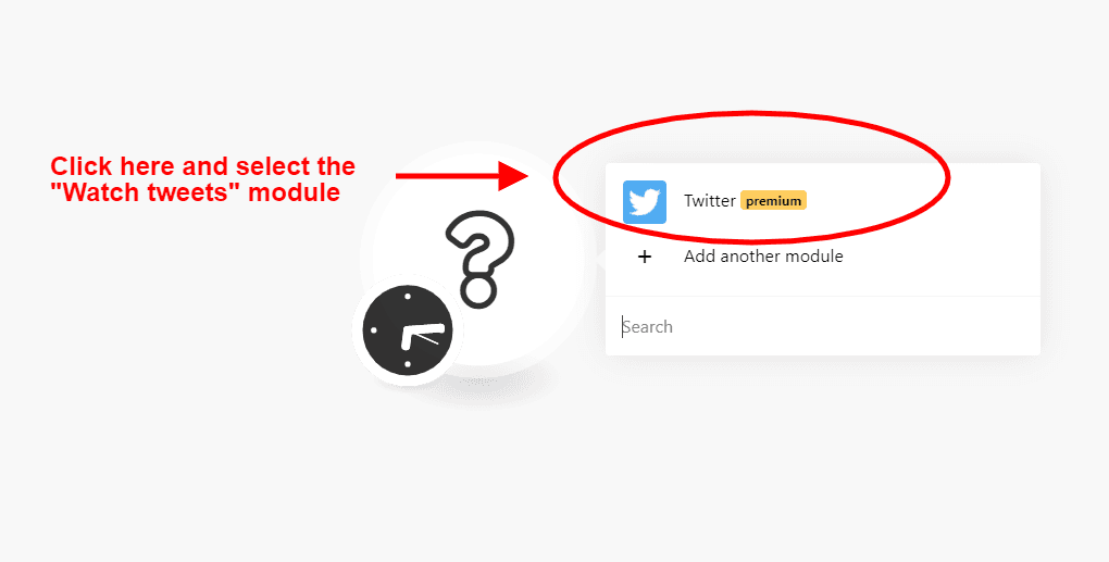 The “Watch tweets” Twitter module is the backbone of the scenario. To set it up, you will have to: