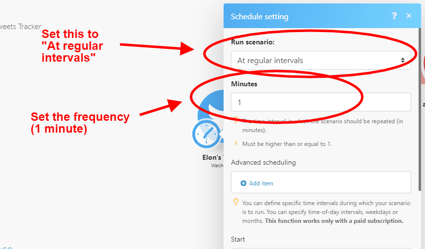 Select the option “At regular intervals” (the scenario will run once a minute, 24/7)