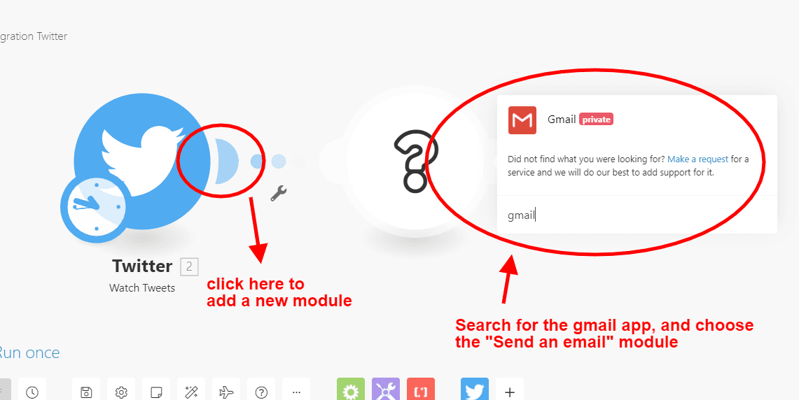 Click on the plus sign next to the Twitter module, and search for the Gmail app in the list of options.