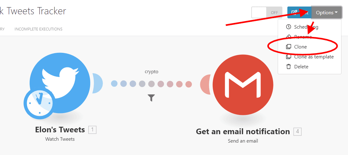 Whenever there’s a match (i.e. a new Elon tweet containing either “bitcoin” or “dogecoin”), Make will let us know over email, instantly.