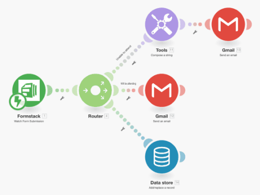 Using Make, you can leverage the Formstack integration to not only automatically send the data to other cloud services, but also segment and manipulate the data before it is consumed.