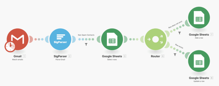 It will then send the parsed data through a router to either update a row in Google Sheets (if the contact exists) or add a new row to a Google Sheet (if the contact is new).