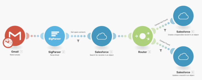 It will parse out data like phone number, address, title, etc. It will then go into SalesForce and either update an existing contact if the contact already exists, or it will create a new contact in SalesForce.