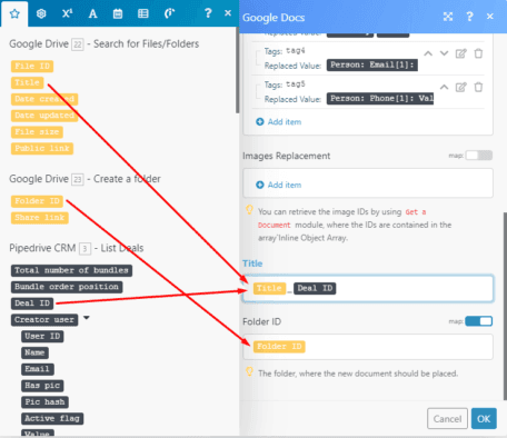 After you add all the tags, scroll down to the Title field. Here, map the Title element outputted by the Google Drive > Search for files/folders module and then map the Deal ID element outputted by the Pipedrive CRM > List deals module.