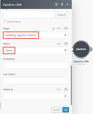 Finally, you need to update the deal in Pipedrive using the Pipedrive CRM > Update a deal module.