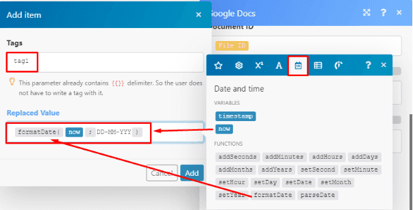 For the first tag, add the current date as the Replaced Value. In the Tags field, type in tag1 and in the Replaced Value field, add the formatDate function found under the Date and Time tab to display the date in a specific format.