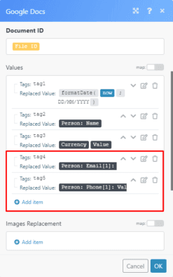 Click on Add item again to create the second tag and use the client’s name as the Replaced Value. Then, map the Person:Name element from the PipeDrive CRM > List deals module to the Replaced Value field: