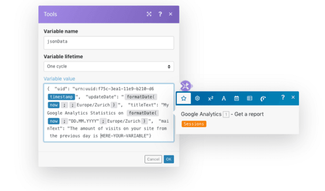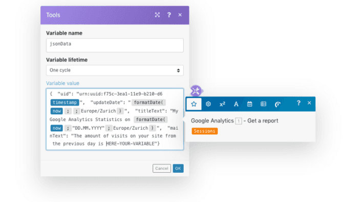 A Flash Briefing Template{ "uid": "urn:uuid:f75c-3ea1-11e9-b210-d6{{timestamp}}", "updateDate": "{{formatDate(now; ; "Europe/Zurich")}}", "titleText": "My Google Analytics Statistics on {{formatDate(now; "DD.MM.YYYY"; "Europe/Zurich")}}", "mainText": "The amount of visits on your site from the previous day is HERE-YOUR-VARIABLE" }