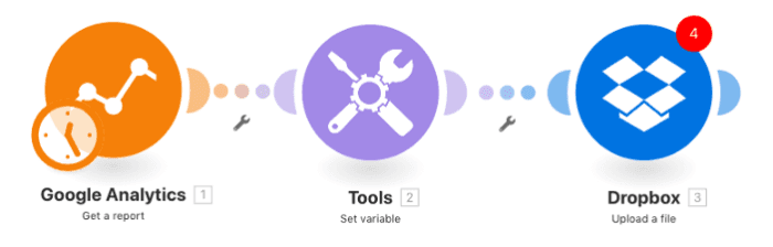 This task is an ideal case for Make. It can connect to your Google Analytics, get the required data about sessions/revenues, etc., save it as a variable and generate a structured text file (JSON) in Dropbox every day without writing a line of code. Let’s start!