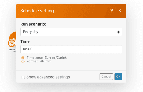 Notice the attached “clock” icon ?. It's where we set how often we want to run the scenario, in other words how often we want to have an updated flash briefing. For our case, we want to set “Run Scenario:” to “Every day” at 6:00 Europe/Zurich. If you are in the Pacific Time zone (-9 hours) and want the same time of update, add nine hours (15:00).