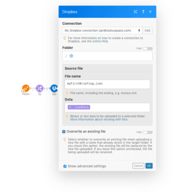 We created a scenario where you automatically get the data from Google Analytics, generate JSON and save it to Dropbox. Let’s try it, press the button “▶️ Run once” in the left bottom corner and see if the “myFirstBriefing.json” file will arrive in your Dropbox. Is it there? It should be.