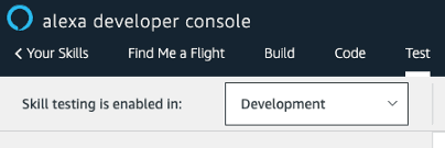 Before we leave the Alexa Developer Console, there is one last important step to do, enabling our flash briefing for testing. We will do it under the “Test” tab in the menu and change the drop down to “Development”.