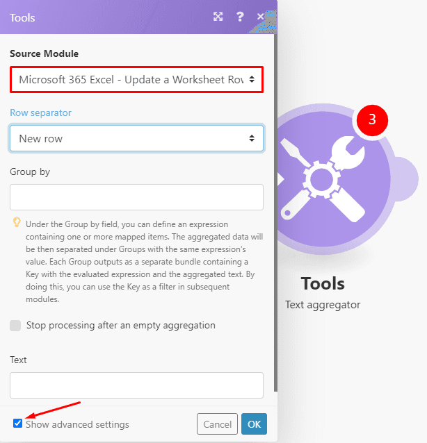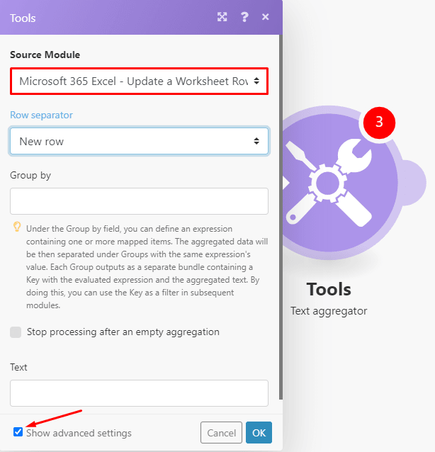After attaching the “Text aggregator” module to the “Excel > Update a Worksheet Row” module, it’s time to configure it.