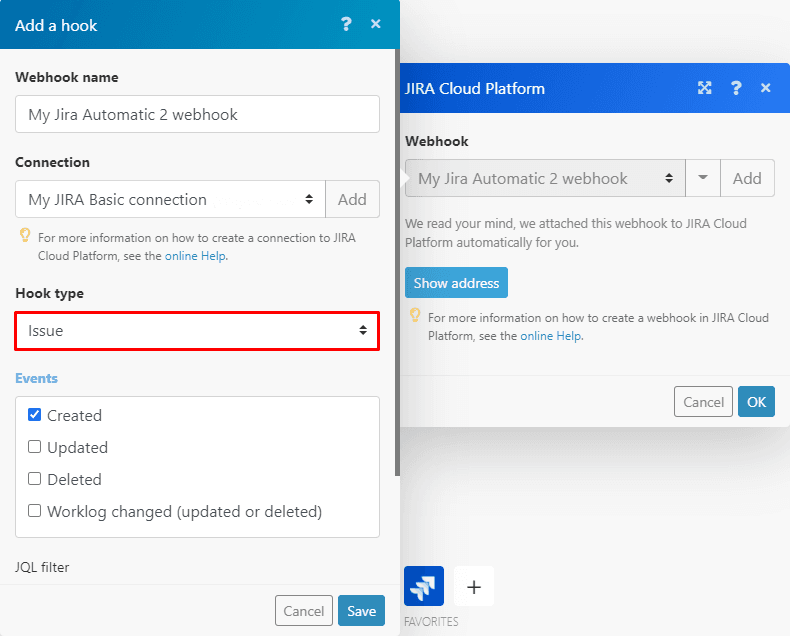Once ready, you can create a webhook that will be used to instantly receive new issues as they are created in Jira.